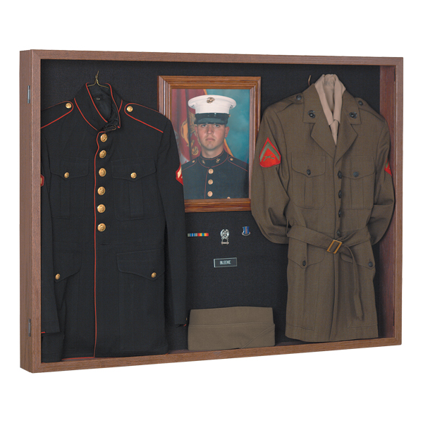 Show off awards and trophies in United Visual Products' Memorabilia Case. Each case has handsome stained wood frame and a fabric back in your choice of color. The Plexi-glas front offers a clear view of your items, without the risk of shattered glass. Comes with hook-and-loop strips. Available with or without a lock. Select from several frame and background colors.